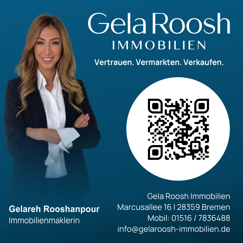 Ich bestätige, dass ich/wir ausschließlich bei Beurkundung des Kaufvertrages für die hier angebotene Immobilie eine Käuferprovision an Gela Roosh Immobilien zahle/n. Mir ist bekannt, dass die Maklerin einen provisionspflichtigen Maklervertrag in gleicher Höhe mit dem Verkäufer abgeschlossen hat (dies gilt nur für Vereinbarungen, bei denen eine Käufer- und Verkäuferprovision festgelegt ist).